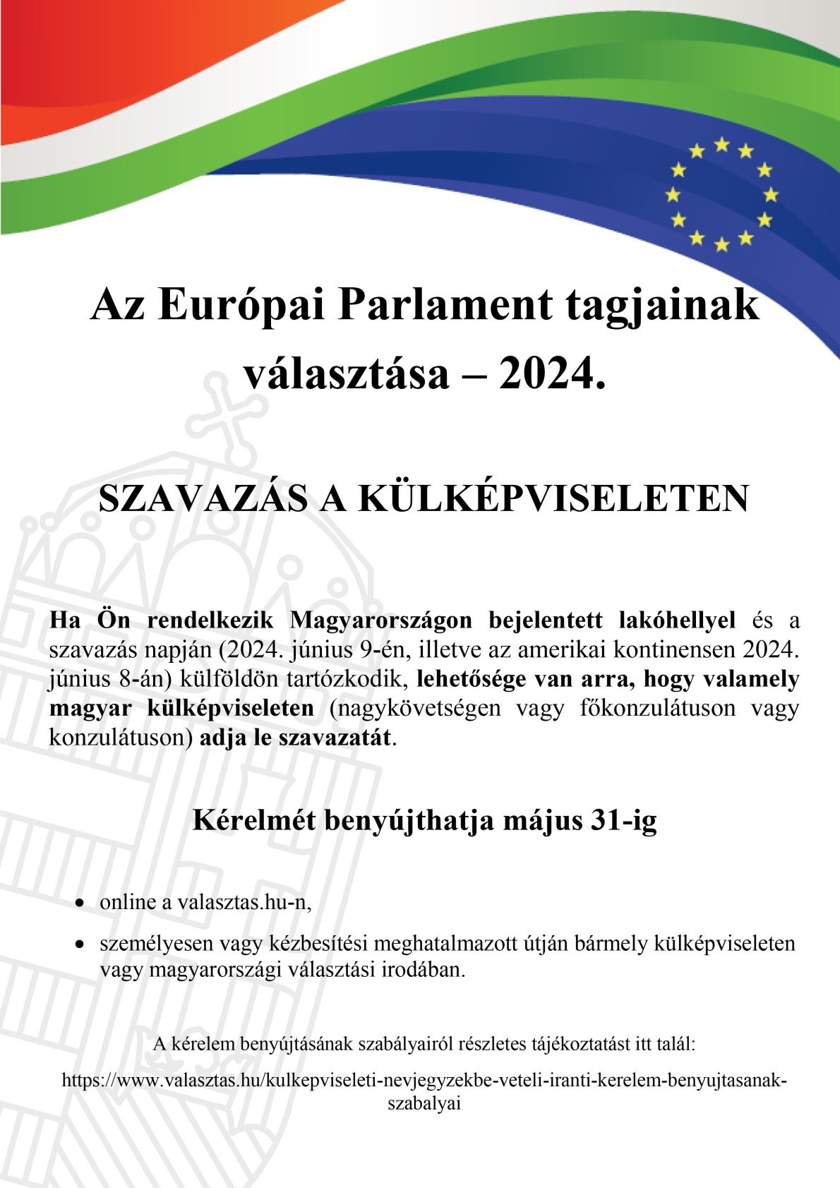 2024. június 9-én európai parlamenti választásokat tartanak, mely során lehetőség nyílik a külképviseleteken való szavazatleadásra. A kapcsolódó aktualitásokért és tudnivalókért figyeljék külképviseletünk hivatalos kommunikációs csatornáit.